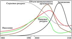 Острота глобальных проблем, связанных с противоречиями между обществом и окружающей средой, обусловлена их связью с безопасностью земной цивилизации. Современная высокоразвитая технологическая цивилизация потеряла способность к саморегенерации, которой обладали более примитивные древние и средневековые общества. Если она рухнет в результате какого-либо катаклизма, то восстановить ее будет практически невозможно. Даже если человечество при этом выживет, оно не сможет вернуться в «век железа», поскольку большинство запасов основных полезных ископаемых уже истощено до такой степени, что для их добычи потребуются сложные технологии, требующие металлоемкого оборудования. В случае гибели нынешнего «мира техники» новая цивилизация сможет быть только аграрной, но никогда не станет промышленной. Именно с анализа взаимоотношений общества и окружающей среды начались работы Римского клуба. Начальную работу по предложению Клуба провел американский специалист по компьютерному моделированию Дж. Форрестер. Результаты его исследования, опубликованные в книге Мировая динамика (1971), показали, что продолжение прежних темпов потребления природных ресурсов приведет в 2020-х к всемирной экологической катастрофе. Созданный под руководством американского специалиста по системным исследованиям Д.Медоуза доклад Римскому клубу Пределы роста (1972) продолжил и углубил работу Дж. Форрестера. Этот доклад завоевал репутацию научного бестселлера, он был переведен на несколько десятков языков, само его название стало нарицательным. Авторами этого доклада, самого известного из опубликованных Римским клубом, было разработано несколько моделей, построенных на экстраполяции наблюдающихся тенденций роста населения и истощения известных запасов природных ресурсов. Согласно стандартной модели, если не произойдет никаких качественных изменений, то в начале 21 в. сначала начнется резкий спад среднедушевого промышленного производства, а затем – и численности населения планеты (Рис. 2). Даже если количество ресурсов удвоится, то глобальный кризис лишь отодвинется до примерно середины 21 в. (Рис. 3). Единственным выходом из катастрофической ситуации виделся переход к планируемому в мировом масштабе развитию по модели глобального равновесия (фактически – «нулевого роста»), то есть сознательная консервация промышленного производства и численности населения (Рис. 4).