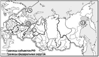A19. Какое из перечисленных государств по форме правления является республикой? 1) Швеция 2) Франция 3) Таиланд 4) Испания A20. Что характерно для населения Индии? 1) бóльшая часть населения проживает в городах A21. С какой из перечисленных стран Россия имеет сухопутную границу? 1) Туркмения 2) Швеция 3) Монголия 4) Иран A22. Какой из регионов, обозначенных буквами на карте России, имеет наибольшую среднюю плотность населения? 1) A