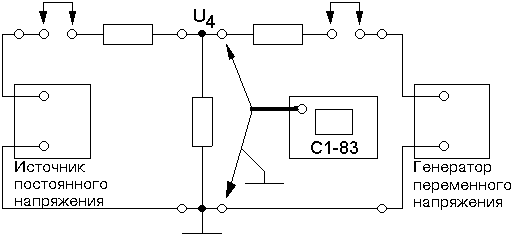 Ознакомившись с описанием приборов, произвести измерения постоянного напряжения = U 1 в схеме 1 (рис. 1) с помощью АВО-5М и осциллографа С1-83 в режиме " I ". Для этого собрать левую половину схемы 1, соединив проводами внешний источник регулируемого постоянного напряжения с клеммами (" I "), ("земля"). Выходное напряжение источника выбрать произвольно. Результаты измерений предъявить преподавателю.