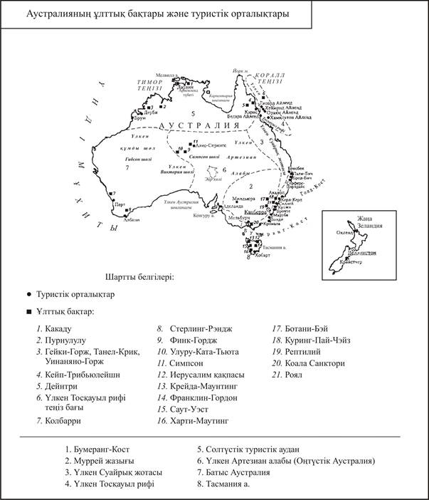 Ағынсыз тұзды көлдердің үлкен тобы материктің оңтүстігінде жатыр. Бұл Торренс, Гэрднер, Фром, т.б. көлдер таяздап, құрғақ уақытта жекелеген су қоймаларына бөлінеді және күшті жаңбырдан кейін тасиды. Олардың барлығы кең сортаң алқаптармен қоршалып жатыр. Аустралия халық аз қоныстанған құрлық болып табылады (18 млн-дай адам). Халықтың орташа тығыздығы 1 шаршы шақырым жерге 2,3 адам. Халықтың аз қоныстануына қарамастан, Аустралия жоғарғы урбандалған мемлекеттің бірі. Халықтың 90%-ы қалада қоныстанған. Аустралия ерекше қорғауға алынған аумақтарға бай құрлық. Бүгінде мұнда 2500 ерекше қорғауға алынған аумақтар бар, олар шамамен 33 млн га алып жатыр. Аустралияның қорғауға алынған нысандарының 11-і ЮНЕСКО-ның тізіміне енгізілген. Аустралияның негізгі туристік ресурстарына мыналар жатады: - жағажайлар, мұнда жартасты шоқылар мен ақ құмды жағажайлар алмасып келіп отырады (Бумеранг-Кост, Күн жағалауы); - Аустралияның орталық шөлдеріндегі құмды жазық, жекелеген құздардың, дюналардың жер бедері (Аутбек тасты үстірті, Эрз-Рок тауы материктің ортасында орналасқан қасиетті тау қалдығы; Хамерсли, Маунт Огюст ежелгі шөлді таулар); - Маржан рифтерімен жақын жатқан сансыз аралдар (ұзындығы 2000 шақырымға созылып жатқан Үлкен Тосқауыл рифі, Гавай аралдары ендігіндегі тропиктік климатты көптеген ұсақ аралдар); - Аустралияның қорғауға алынған аумақтары, олардың тарихы 1879 жылғы POYAL ұлттық саябағын қорғаудан басталған. Қазір Аустралияда Кейп Трибулейшн, Какаду, Улуру, Фрэнклин Гордон, Сент-Клер, Крейдл-Маунтин-Лейк (Тасмания аралы) және т.б. ұлттық саябақтар бар; - Емдік бұлақтардың шығуы (Мори тауы жағалауындағы Мельбрунге жақын жатқан Дейлс-Форт); - Тынық (Брисбен, Канберра, Сидней) және Үнді мұхиты (Мельбурн, Аделаида, Перт) жағалауындағы қалалардың тарихи-мәдени ескерткіштері. Туристік-рекреациялық аудандастыруы бойынша Аустралия мынадай аудандарға бөлінеді: Бумеранг-Кост ауданы (Аделаидадан Брисбенге дейін); Муррей өзенінің алабы; Үлкен Суайрық жотасы; Үлкен Тосқауыл рифі; солтүстік туристік аудан; Үлкен Артезиан алабы; Батыс Аустралия; Тасмания аралы. Бумеранг-Кост ауданы. Бұл – Үлкен Суайрық жотасы мен Тынық мұхиты жағалауы аралығындығы төбелі жазықты аудан. Бұл жерге ылғалды және қоңыржай климат тән. Параматта өзенінің сағасында орналасқан Сидней қаласы осы ауданның ірі қаласы. Халық саны – 3,7 млн-дай адам (ел халқының 20%-ын құрайды). Қаланың негізі 1788 ж. аборигендерден тартып алынған жерде қаланған. Қаланың Сидней аталуы лорд Сидней есімімен байланысты. Қаланың басты екі символдары –Харбор-Бридж аркалы көпірі (Каунтангер), сондай-ақ тартылған желкен формасындағы атақты опера ғимараты. Сиднейдің маңызды ескерткіштерінің қатарына мыналар жатады – Сидней мұнарасы (300 м), нумизматика мұражайы және Минт филтелиясы, отарлық үлгідегі кварталда орналасқан парламент ғимараты, Ұлттық кітапхана, 1816 жылы тропикалық оазис ретінде қала орталығында негізі қаланған Король ботаникалық бағы, Дарлинг-Харбор (60 га саябақ және бақтар), Ұлттық теңіз мұражайы, Сидней аквариумы, Қытай бағы, 1817 ж. құрылған Гайд-Парк-Барак. Қазір Аустралия қоғамының тарихи мұражайы орналасқан. Сиднейден оңтүстікке және солтүстікке қарай бірнеше шақырымға созылған құмды жағажайлар орналасқан. Қаладан оңтүстікке қарай Куджи Бронтье және Марубра жағажайлары орналасқан. Сиднейдің е