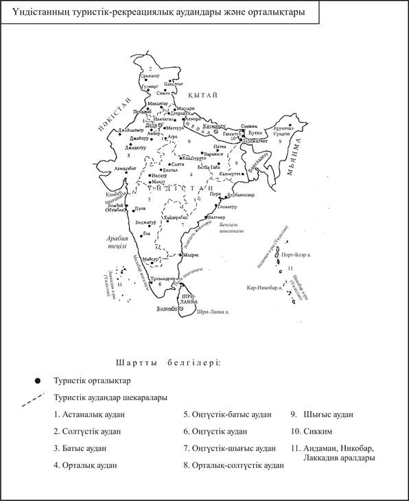 Үндістанның туристік-рекреациялық және тарихи-мәдени әлеуетін мыналар құрайды: 3 негізгі табиғи аймақтың – Гималай, Үнді-Ганг ойпаты және Декан таулы үстірті (базальтты жазықтық) экзотикалық табиғаты; этникалық калейдоскоп және мәдениет; қызықты діни және ұлттық мейрамдар; Үндістанның Варанси, Патна, Дели, Мадурай сияқты ежелгі қалалары. Үндістанның ауқымды архитектуралық ескерткіштері ежелгі және ортағасырлық кезеңдерге жатады. Қасиетті 1000-нан аса шіркеу мен сарайларды Үндістанда «ашық аспан мұражайы» деп атайды. Туристік-рекреациялық аудандастыруда Үндістан 11 маңызды ауданға бөлінеді: астаналық, солтүстік, батыс, орталық, оңтүстік-батыс, оңтүстік, оңтүстік-шығыс, орталық-солтүстік, шығыс, Сикким және де Үнді мұхиты аралдары. Астаналық аудан Дели қаласын және оның маңындағы аймақтармен қосқанда 1,5 мың шаршы шақырым аумақты қамтиды. Дели – Үндістанның туристік орталығы. Қала туралы алғашқы деректерге Махабхаратаны жатқызады (б.з.д. 1400 ж.). Қала ескі және Жаңа Дели болып бөлінеді. Ең басты көшесі Канди Каукте – халықтың көп жиналатын орны үлкен базар орналасқан. Мұндағы көптеген сәулет ескерткіштер – қасиетті мұсылман ескерткіштері (Қызыл форт, мешіттер). Жаңа Дели ағылшындықтардың қол астында болғанда бой түзеді. Бұл қала ескі, көп құрылымды бизнес орталығы болған. Делидегі – Қызыл Форт, Джама Масджид, Радж Гхат, Джантар Мантар, Лаакшми Нараян ғибадатханасы, Кутб Минар, Үнді қақпалары, Секретариат ғимараты, Раштрапати Бхаван, Парламент үйі, Ұлттық мұражай, Қазіргі заманғы Ұлттық өнер галереясы, Дж. Неру мұражайы, Ұлттық қолөнер мұражайы, Сафдарджунг қабірі, Ұлы мешіт, Ұлы моғолдарды қабылдайтын қоғамдық зал, Ранг-Махал сарайы, Інжулі мешіт, ХVІІ ғ. Кутб-Минаре мұнарасы, ғасырлар бойы дат баспайтын металды бағаналар – әлемдегі кереметтердің бірі. Кутб-Минар. Дели тарихының ежелгі дәуірінің ең тамаша құрылысына б.э. XII ғ. жататын Кутб-Минар (Жеңіс мұнарасы) жатады. 1199 ж. Кутб-Минар мұнарасын Кутб-ад-дин салған. Конус тәрізді биіктігі 72,5 м-ге жететін бес қабатты мұнара қызыл-сары құмнан салынған және әдемі өрнектермен безендендіріліп, Құраннан нақыл сөздер ойып жазылған. Кутб-Минар кешенінің аумағында әлемдегі жұмбақ құрылыстардың бірі – б.э. IV ғ. құйылған әйгілі Темір бағана орын тепкен. Ол туралы мынадай ескі сенім бар: кімде-кім бағанаға арқасын қаратып тұрып, оны қолымен ұстаса ол адамның арман-тілегі орындалады. Үнділер бағананың таң қаларлық күші бар екеніне ерекше назар аударады. Шындығында бағана құйылған темірдің ерекше қасиеті бар, XV ғ. бұрын салынса да темірді тот баспаған. Бұл құпия ғылымда ашылмаған. Кейбір ғалымдар Темір бағананы ежелгі жоғалып кеткен өркениеттің сирек куәгерлерінің бірі деп есептейді. Лакшми-Нарайан хибадатханасы. Жаңа Делидің ескерткіштерінің бірі Кришна (Нарайана) құдайға және оның зайыбы Лакшмиге арнап ақшыл-қызғылт мәрмәрден салынған Лакшми-Нарайан ғибадатханасы болып табылады. Индуистік діндегі кеңінен таралған құдайлар Кришна мен Лакшми – махаббат пен отбасылық бақыт жебеушісі. XX ғ. басында елдегі бай адамдардың қайырымдылық қаражаттарымен салынған және Махатма Гандидің қатысуымен ашылған. Қызыл Форт. Қызыл Форт немесе Лал-Кила аты қызыл құмдағына байланысты аталған, ал осы құмнан оның қабырғалары тұрғызылған. Қабырғаның периметрдегі ұзындығы 2,4 шақырым., ал биіктігі өзен жағ
