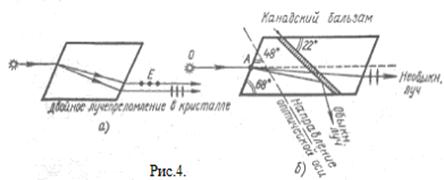 При преломлении света на границе оптически анизотропных сред, например кристаллов, луч естественного света расщепляется на два луча (обыкновенный и необыкновенный), поляризованные в двух взаимно перпендикулярных плоскостях. Обыкновенный и необыкновенный лучи имеют в кристалле разные скорости распространения, следовательно, различные показатели преломления по и пе; этим объясняется двойное лучепреломление в точке падения волны на грань призмы: при одном и том же угле падения имеются два угла преломления βо и βе. Однако поляризованные лучи выходят из кристалла под очень малым углом друг к другу, что затрудняет их раздельное использование. Чтобы «развести» эти лучи, пользуются различными «поляризующими призмами». Наиболее распространенной является призма Николя: из кристалла исландского шпата вырезаются две призмы, которые склеиваются канадским бальзамом. Показатель преломления этого клея (п =1,550) лежит между показателем преломления исландского шпата для обыкновенного (по =1,658) и необыкновенного пе лучей (значение пе зависит от угла между лучом и оптической осью кристалла, его минимальное значение 1,486). Углы в призме подобраны так, чтобы обыкновенный луч на поверхности канадского бальзама испытал полное внутреннее отражение. При помощи этой призмы световая волна разделяется на две плоскополяризованные волны, содержащие почти до 50% падающей энергии (потери в призме невелики).