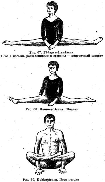 Поднятая поза лотоса 1-я фаза: принять позу лотоса. Ладонями опереться о пол. 2-я фаза: приподнимите тело на вытянутых руках. 3-я фаза: вернитесь в исходное положение. Дыхание нормальное. Концентрация на трапециевидных мышцах. Динамический вариант: попеременно повторяйте 2-ю и 3-ю фазы. Статический вариант: задержитесь в конечной позе на нужное время. Расслабление в позе лотоса или прямого угла. Поза петуха (рис. 69) 1-я фаза: принять позу лотоса. 2-я фаза: проденьте сначала одну, а затем вторую руку между бедрами и голенями. Обопритесь ладонями о пол и приподнимите тело на вытянутых руках. 3-я фаза: возвратитесь в исходное положение. Дыхание нормальное. Концентрация на трапециевидных мышцах. Динамический вариант: попеременно повторяйте 2-ю и 3-ю фазы. Статический вариант: задержитесь в конечной позе на нужное время. Расслабление в позе лотоса или прямого угла, Поза петуха на одной руке (рис. 70) 1-я фаза: принять позу лотоса. 2-я фаза: проденьте правую руку между бедром и голенью левой ноги. Обопритесь правой рукой о пол и приподнимите тело вверх. 3-я фаза: вернитесь в 1-ю фазу. 4-я фаза: проделайте то же на левой руке. 5-я фаза: вернитесь в исходное положение.