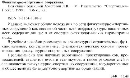 АВТОРСКИЙ КОЛЛЕКТИВ Аристова Л.В. Быкова Г.И. Голубинский А.П. Жура Ю.Г. Климентьев Н.А. Кондратенков А.Н Кузьмичева Е.В. Лось Е.М. Макарова И.И. Машинский В.А. Мезенцева Н.Б. Николаева Л.Н. Никольский А.Я. Погожева Т.А. Разин Ф.С. Румянцева В.П. Рябов К. К. Рязанова Е.В. Стригалева Н.С. Травуш В.И. Швейцер И.С. МЕЖДУНАРОДНАЯ АССОЦИАЦИЯ «СПОРТИВНЫЕ СООРУЖЕНИЯ» ФИЗКУЛЬТУРНО-СПОРТИВНЫЕ СООРУЖЕНИЯ Под редакцией Л.В. Аристовой РЕКОМЕНДОВАНО Министерством Российской Федерации по физической культуре, спорту и туризму в качестве учебного пособия для студентов и учащихся физкультурно-спортивных специальностей