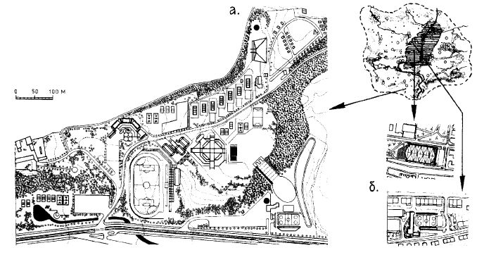 СЕТЬ ФИЗКУЛЬТУРНО-СПОРТИВНЫХ СООРУЖЕНИЙ ____________________________________________________________ 33 Различия в составе спортивных центров могут быть охарактеризованы соотношением объемных и плоскостных сооружений. Если за единицу измерения принять для объемных сооружений 1 м2 площади пола зала или зеркала воды бассейна, а для открытых плоскостных - 1 м2 полей и площадок, то в наиболее распространенных типах спортивных центров это соотношение составит для промежуточной зоны 1:4 — 1:6. В центральной же зоне встречаются спортивные центры с соотношением 1:2, а иногда даже 2:1. Увеличение доли объемных сооружений за счет плоскостных диктуется также желанием рационально использовать площадь участка, строить сооружения, работающие круглый год, вне зависимости от сезона и погоды. В крупнейших зарубежных городах также можно проследить различия в формировании сети спортивных сооружений в зависимости от места их расположения в городе. Чем ближе к центральной зоне размещается спортивный комплекс, тем выше, как правило, плотность его застройки, больше доля крытых сооружений. В новой, периферийной, застройке часто формируются крупные районные центры, занимающие 8 — 12 га. Авторы планировки новых жилых массивов стараются вынести эти спортивные центры в примыкающие зоны рекреации, где объемные сооружения свободно размещены по участку (рис. 1.3.2 и 1.3.3,а). В центральных, уплотненных, районах многоэтажной застройки размеры участков сокращаются до 0,6 — 0,8 га, резко снижается доля плоскостных сооружений и озеленения (рис. 1.3.3,б). Специфика формирования спортивных сооружений крупнейшего города проявляется на всех уровнях обслуживания и возрастает от начальных (придомовые, микрорайонные) до общегородских. Формирование сооружений микрорайонного, районного уровней в новых, преимущественно периферийных, районах крупнейших городов формируются в зависимости от градостроительных факторов, действующих по-
