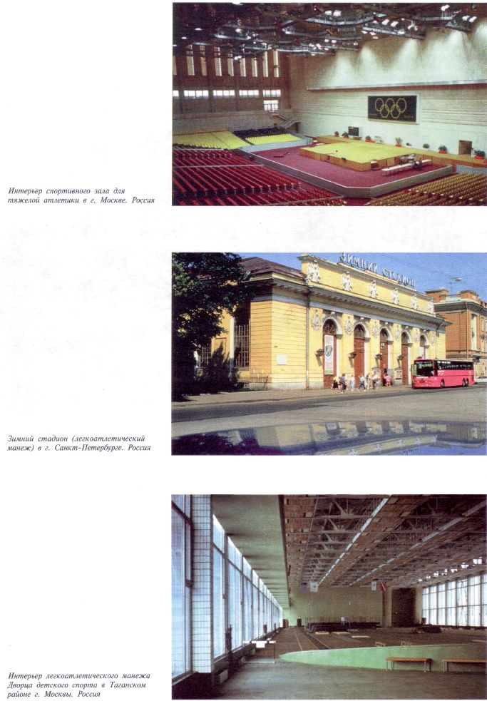 92 физкультурно-спортивные сооружения Один из важнейших компонентов классности стадиона - это непрерывное повышение надежности обеспечения безопасности участников и зрителей согласно требованиям международных организаций и нормативным актам России1. Поиски новых решений стадионов - более экономичных в строительстве и в эксплуатации, более удобных и привлекательных как для занимающихся, так и для зрителей, выразительных по архитектуре и конструкциям ведутся в проектировании и строительстве постоянно и оказывают влияние на общее развитие архитектуры.