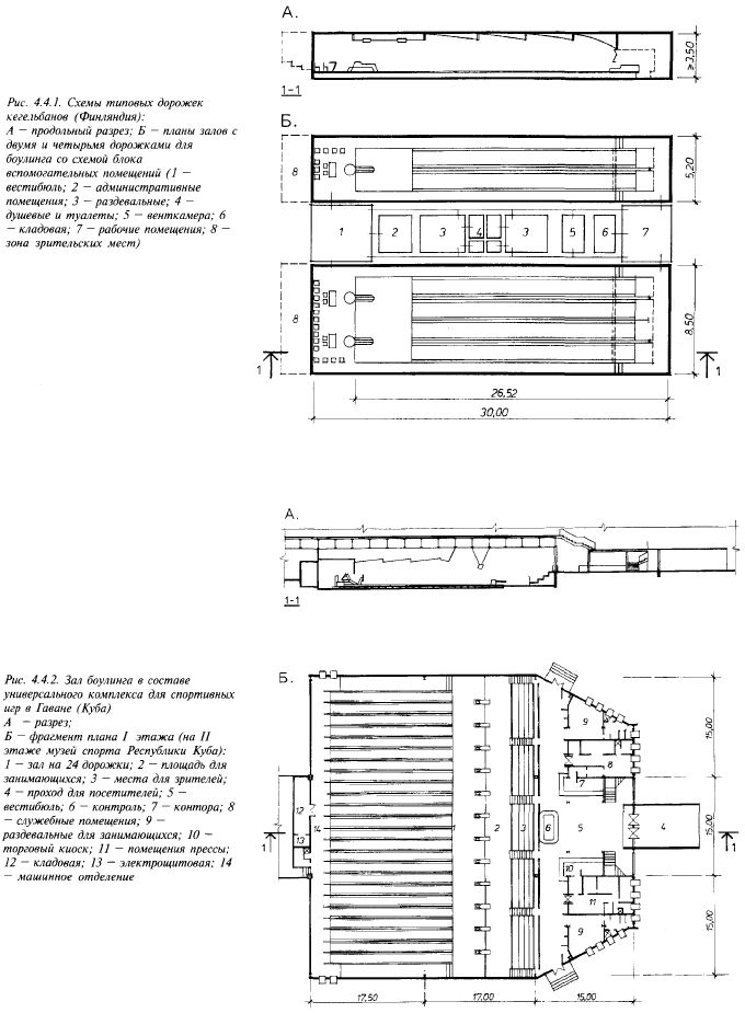 Залы для игры в кегли — кегельбаны — самые распространенные и популярные среди залов спортивных игр с досуговыми и развлекательными функциями. Кегельбан — дорожка для кеглей, но кегельбаном называют и зал, где установлены кегельбаны. Суть игры — шаром сбить поставленные на расстоянии и в определенном порядке кегли. Игра, похожая на кегли, была известна еще в Древнем Египте. В Европе разные варианты игры в кегли существовали уже около полутора тысяч лет назад. Первые европейские переселенцы перенесли кегли в Северную Америку, где игра получила название боулинг и широко распространилась, особенно десятикеглевый боулинг, который и стал впоследствии распространенной разновидностью игры в кегли во всем мире. Его доля — 95 % от числа зарегистрированных игроков в кегли во всем мире. В боулинг можно играть на уровне спортивного развлечения, любительских физкультурно-оздоровительных занятий и на уровне большого спорта с международными соревнованиями. Популярность боулинга объясняется и возможностью игры на небольшой площади в течение всего года, т.к. за последние десятилетия игра перенесена в помещения, оборудованные на высоком техническом уровне. Кегельбан привлекает как мужчин, так и женщин любого возраста и с различным уровнем физической подготовки. Популярности боулинга в досуге способствует общение как во время игры, так и просто при посещении зала для боулинга. Помимо основного зала для игры в состав кегельбанов включаются бары, кафе, рестораны, помещения для отдыха и игр. Кегельбан обслуживает от 3 до 12 тыс. жителей на одну боулинговую дорожку. Исходя из перспектив развития игры в боулинг в нашей стране можно ориентироваться на 3 — 5 тыс. жителей на одну боулинговую дорожку. Наименьший кегельбан для всеобщего пользования включает четыре дорожки для боулинга (рис. 4.4.1). Кегельбаны, как правило, размещаются в общественном центре города или района, включаются в торговые, спортивные, деловые, досуговые сооружения, иногда они проектируются отдельностоящими. Кегельбан должен находиться в пределах пешеходной доступности от остановок общественного транспорта и иметь автостоянки. При проектировании кегельбана начиная с вестибюля разделяются зоны для зрителей и игроков, так как кегельные дорожки очень чувствительны к загрязнению. Кегельбан проектируется с учетом использования его инвалидами с нарушением опорно-двигательного аппарата. Инвалиды играют сами или наблюдают в качестве зрителей за игрой других. Примерно 25 % площади раздевальных отводится женщинам. Кегельбан включает, как правило (рис. 4.4.1 — 4.4.2), кегельные и разго-ночные дорожки; площадку для игроков; раздевальные; душевые; туалеты; вестибюль; места для зрителей; кафе; складские и хозяйственно-бытовые помещения; технические помещения; кассу и диспетчерский пункт; конторские помещения и комнаты для собраний; помещения для персонала. Кегельные дорожки с автоматической системой установки кеглей и возврата шаров — сложное и точное спортивное оборудование. Требования к покрытиям дорожек — прочность, износостойкость, гладкая поверхность. Кегельные дорожки делают из деревянных реек, комбинируя твердые и мягкие породы древесины и покрывая специальным лаком. Набор осуще- ствляется либо на месте, либо из готовых элементов заводского изготовления. Международная фе