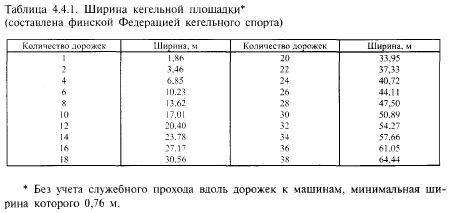 СПОРТИВНЫЕ ЗАЛЫ 131 нований и пластиковое покрытие с некоторыми конструктивными частями из пластмасс. Для эксплуатационного ухода эти дорожки удобнее. В Восточной Европе встречаются кегельные дорожки с асфальтобетонным покрытием. Их конструкция проще и дешевле. Десятикеглевый боулинг проводится только на деревянных или пластиковых дорожках. Дорожка для боулинга имеет международные стандартные размеры: длина 19156 мм плюс длина разгоночной дорожки 4570 — 4880 мм. На одной дорожке одновременно играют от 2 до 5 человек. Ширина кегельной площадки определяется в соответствии с количеством кегельных дорожек (табл. 4.4.1). Количество дорожек обычно четное, так как желоб для автоматического возврата шаров — один на две дорожки. Установка кеглей в конце дорожки и возврат шаров по скрытому желобу осуществляются автоматической машиной. Кегли весом 1,5 кг, высотой 38 см, диаметром в утолщенной части 10 см изготавливаются из твердых пород дерева с пластмассовым покрытием толщиной 1 - 2 мм, защищающим кеглю при падении. Шары диаметром 22 см, весом от 4,5 до 7,3 кг изготавливаются из каучука, или смеси каучука и пластмассы, или из пластмассы. В зависимости от вида игры шары имеют или не имеют углублений для пальцев.