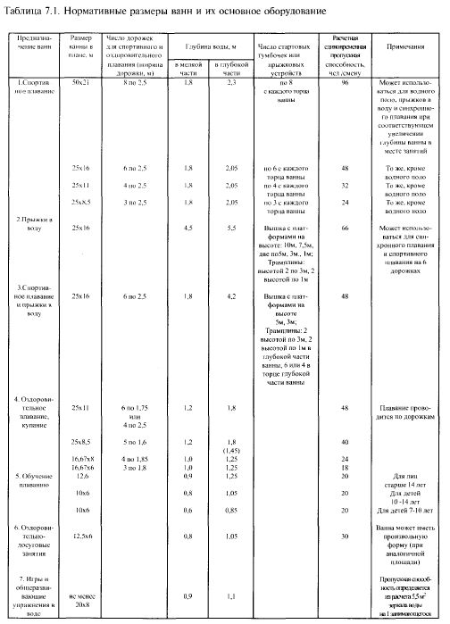 Строительство ванн для учебно-спортивной работы и соревнований только по одному виду спорта почти всегда экономически нецелесообразно. Чаще всего предусматривается универсальное использование ванн с соответствующим их оборудованием и размерами (табл. 7.1, рис. 7.11). Ванны для обучения плаванию предусматривают в составе каждого бассейна для учебно-спортивных занятий, а также в бассейнах оздоровительно-