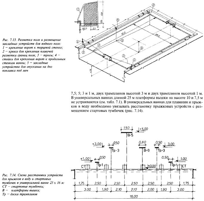 досугового назначения. Ванны для обучения плаванию детей в возрасте до 10 лет целесообразно устраивать напольными или с заглубленными обходными дорожками по трем сторонам ванны (рис. 7.12). Для обучения плаванию подростков и взрослых ванна может предусматриваться заглубленной. Разметка поля для водного поло и размещение закладных устройств для крепления оборудования приведены на рис. 7.13. В ваннах для прыжков в воду предусматривается, как правило, комплект прыжковых устройств, состоящий из вышки с платформами на высоте 10;