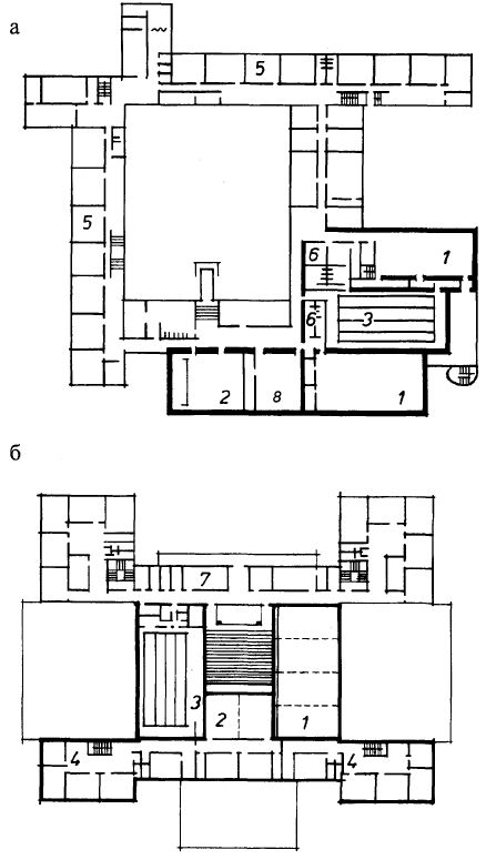 Спортивные комплексы школ — наиболее распространенный тип комплексов в системе физкультурно-спортивных сооружений городов и сельских населенных мест. Например, город с 200 тыс. жителей имеет обычно 6-8 районных и городских комплексов сети общего пользования, включая сооружения предприятий, спортобществ, ведомств. Но в том же городе функционирует не менее 25 спортивных комплексов школ. Состав школьных комплексов традиционен: обязательно — набор открытых плоскостных сооружений (в разных сочетаниях игровые площадки, школьное спортивное ядро, гимнастический городок), школьный спортивный зал, а в крупных школах — два, иногда один бассейн. Наиболее активно используется спортивный зал, так как на оптимальное время работы плоскостных сооружений приходятся школьные каникулы, а бассейнами школы пока почти не располагают. Спортивные залы школ составляют 65 % спортивных залов страны. Однако обеспеченность учащихся спортзалами в настоящее время такова, что на 1 ученика приходится лишь 0,3 — 0,4 м2 площади пола. Это 70 - 75 % от той нормы, по которой рассчитывались спортивные залы в отечественной практике. Разработанный в НИИ общественных зданий норматив (МГСН 4.06.96) составляет не менее 1,4 м2 на 1 ученика, т.е. фактическая потребность в залах при двух обязательных уроках в неделю, ежедневном "спортивном часе" в группах продленного дня удовлетворена всего на 25 %. Не соответствует школьной программе и номенклатура залов, так как в основном это залы 18 х 9 м (около 45 %) и 24 х 12 м (около 30 %). Залы рассчитаны на занятия одновременно лишь одного класса, их оборудование в большинстве случаев устарело. Особое значение приобретает использование школьных залов населением. Однако это редко осуществляется из-за организационных сложностей, а также не предусмотренного проектом автономного использования спортивной зоны школьного здания. В каждой школе должны быть условия для занятий всеми основными видами спорта, т.к. функциональная структура каждого урока основана на комплектности, включая элементы общефизической подготовки, легкой атлетики, игр с мячом, гимнастики. Кроме того программами предлагаются занятия боксом, борьбой, тяжелой атлетикой и соревнования по различным видам спорта. Спортивные залы школ должны быть рассчитаны на интенсивное многофункциональное использование со сменой оборудования и трансформацией зала не только между занятиями, но и в течение каждого из них (см. раздел 4.2). Номенклатура спортивных залов в школьном комплексе должна соответствовать особенностям физкультурно-спортивной работы со всеми контингентами населения. Для академических и секционных занятий каждая параллель (включающая по одному классу с I по XI) должна иметь кроме зала 30 (36) х 18 м помещения для тренажеров (9x6 или 18 х 6 м) и площадку 24 х 15 (12) м (в отдельном зале или на площади трансформируемого зала), а также зал для младших классов 18 х 12 - 24 х 15 (12) м. Начиная с трех параллелей (33 класса) целесообразен секционный транс- КОМПЛЕКСЫ ФИЗКУЛЬТУРНО-СПОРТИВНЫХ СООРУЖЕНИЙ______________________________________________________ 289 формируемый зал 45 (42) х 24 м, делящийся на 3 части. Для 3 x 3 параллели возможен зал 75 (72) х 24 м, делящийся на 5 частей (секций), с габаритами, кратными площадке 24 х 15 (12) м, размещаемой поперек зала. Нескольким малым залам для спортивных игр и легкой атлетики следует предпочесть общие трансформи