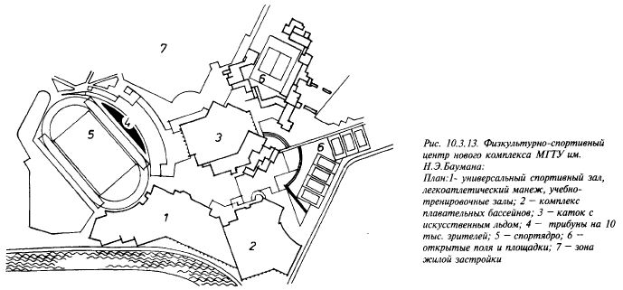 В общей системе физического воспитания населения существенную роль играет спортивно-массовая и физкультурно-оздоровительная работа ВУЗов. Из студентов формируются команды высшего уровня. Будущим работникам умственного труда физическая активность особенно нужна для сохранения здоровья. Однако существующая сеть спортивных сооружений ВУЗов, состоящая в значительной мере из приспособленных или построенных по типовым проектам зданий, не отвечает этим задачам ни количественно, ни качественно. Одна из основных проблем развития сооружений ВУЗов — реконструкция и модернизация сложившейся сети, и прежде всего увеличение числа крытых сооружений, приведение их параметров в соответствие с современными типологическими требованиями. В последние годы появились проекты вузовских спортивных комплексов, привлекающие внимание не только нетрадиционным составом сооружений, но и новым подходом к формированию пространственной структуры. Эти комплексы, как правило, размещаются на территориях с высокой стоимостью земли, часто — в сложившейся застройке. Поэтому проекты отличаются интенсивностью использования территории. В отличие от традиционного павильонного построения комплекса авторы предлагают, например, анфиладное построение зальных пространств (рис.10.3.13). Объединяя большепролетные элементы различной высоты, создают своеобразные композиции. Проектируются крытые пешеходные улицы, сочетающиеся с полуоткрытыми пространствами. Объединяются атриумы, вестибюльные группы, фойе, залы отдыха. Активно используется стилобатная часть здания для вспомогательных служб комплекса. Применяется ярусное расположение спортивных залов, не только существенно повышающее интенсивность использования территории комплекса, но и создающее выразительные композиционные доминанты. Примеры подобных уникальных комплексов в отечественной практике пока единичны. За рубежом спортивные комплексы крупных ВУЗов входят в число самых представительных спортивных сооружений городов и учебных центров. Однако для условий нашей страны важен сейчас не столько опыт создания уникальных объектов, сколько рекомендации по формированию физкультурно-спортивных сооружений рядовых ВУЗов, которых в