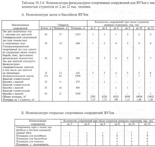 300 физкультурно-спортивные сооружения России свыше 400. Новое строительство и модернизация ВУЗов нуждаются в предложениях по составу спортивных сооружений в зависимости от численности студентов в соответствии с новыми задачами. На основании рекомендуемых объектов и форм занятий всех отделений ВУЗа с учетом предпочитаемых видов спорта при их свободном выборе, с учетом распределения по сезонам объемов занятий между залами, бассейнами и открытыми плоскостными сооружениями, предлагается номенклатура физкультурно-спортивных сооружений для ВУЗов с числом студентов от 2 до 12 тыс. чел. (табл. 10.3.4).