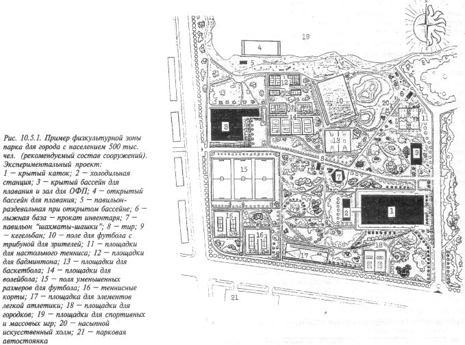 Парк культуры и отдыха - наиболее распространенный и массовый тип многофункционального парка. Он играет большую роль в системе физического воспитания. Первым был открыт в Москве в 1928 году Центральный парк культуры и отдыха им. М. Горького. Деятельность его определялась сочетанием культурно-воспитательной работы с оздоровлением миллионов трудящихся. Конкурс на его проектирование стал серьезным теоретическим вкладом в молодую советскую науку паркового строительства. Главной особенностью парка нового типа стала массовость посещения. Это и определило направления проектирования и строительства парков культуры и отдыха. В Москве были созданы парки культуры и отдыха в Сокольниках, Измайлове, Останкине. Возникают парки и в других городах. С 1931 года сеть парков стала быстро расширяться. Сейчас в стране более 2000 парков куль- 310 физкультурно-спортивные сооружения туры и отдыха. Они становятся основным звеном в системе мест массового отдыха горожан. По нашим градостроительным нормам парки разделяются на городские с минимальной площадью 15 га и районные (планировочных районов) — 10 га, время доступности соответственно — не более 20 и 15 мин. В последние годы у нас и за рубежом отмечается тенденция укрупнения площадей городских парков, так как только большие парковые массивы создают полноценные условия для отдыха и способствуют оздоровлению городской среды (по исследованиям ЦНИИП градостроительства - не менее 50 га). Площадь парка должна быть достаточной для размещения сооружений отдыха, рассчитанных на жителей в пределах обслуживания парка. Размещение парков в городе и организация в них физкультурной зоны зависят от природных условий. Природные условия территории определяют архитектурно-планировочную структуру, качество санитарно-гигиенической и эстетической среды, а также индивидуальность и выразительность архитектурно-ландшафтного облика всего парка и его физкультурной зоны. Сейчас уже почти нет, особенно в крупных городах, территорий, пригодных для создания парков. В связи с этим широко используются земли "неудобные" - с повышенной влажностью, сложным рельефом, а также земли с нарушенным деятельностью человека ландшафтом. Используются они в первую очередь для паркового строительства, поскольку низкий удельный вес застройки в парках позволяет предъявлять меньшие требования к качеству территорий. И мировая практика строительства парков, включая многофункциональные, уже накопила опыт использования таких территорий. Парки культуры и отдыха состоят из нескольких зон: физкультурной (15-20 % площади парка), культурно-зрелищной (10), детской (5), тихого отдыха (60), хозяйственной (не более 4-5). Как видно, нормами определены значительные размеры физкультурной зоны в парке, самой большой после зоны тихого отдыха и прогулок. В зонах активного отдыха она занимает ведущее место. К сожалению, в большинстве наших парков площадь физкультурных зон ниже нормативной и определяемой проектами (рис. 10.5.1). Для привлечения населения к массовым физкультурно-оздоровительным занятиям эффективно расширение состава сооружений путем строительства современных комфортных физкультурных сооружений, и в первую очередь крытых (залов, бассейнов). В крытых сооружениях возможна круглогодичная работа. Они рентабельны, так как в парках занятия оздоровительн