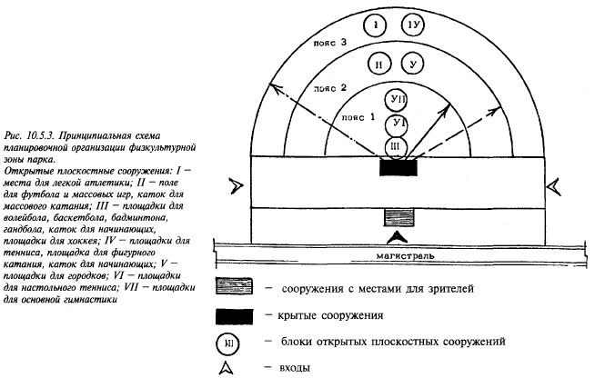 314 физкультурно-спортивные сооружения дованным составом: объемные сооружения - 3 - 5; плоскостные сооружения — 27 — 30; дорожки, аллеи — 10 — 15 % площади зоны. Остальная площадь (50 — 60 %) рекомендуется для зеленых насаждений. Физкультурная зона парка по видам сооружений может быть разделена на три подзоны: сооружения с местами для зрителей (в общегородских парках), подзона крытых сооружений и подзона открытых сооружений (рис.10.5.3).
