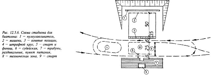 К устройству трасс для биатлона предъявляются требования, аналогичные требованиям к трассам лыжных гонок. Чтобы упражнения в стрельбе проводились на одном стрельбище и соревнования были зрелищными, трассы биатлона прокладывают петлями длиной 4,3; 2,5 км. Стрельбище для биатлона должно отвечать следующим требованиям: 400 ФИЗКУЛЬТУРНО-СПОРТИВНЫЕ СООРУЖЕНИЯ - дистанция стрельбы 50 м (+1 м), - мишени на одном уровне с огневым рубежом, - расстояние между соседними огневыми позициями не менее 2,5 м; - количество огневых позиций равно удвоенному числу команд плюс - соответствие нормам на проектирование открытых тиров. В непосредственной близости от стрельбища на одинаковом расстоянии от всех огневых позиций располагаются штрафные круги длиной 150 м (+5 м). Перед стрельбищем должна быть отгорожена территория шириной не менее 25 м для судей, технического персонала и участников соревнований. В районе финиша и передачи эстафеты на период соревнований должны быть оборудованы пункт питания и теплые раздевальные для каждой команды (рис. 12.5.6).