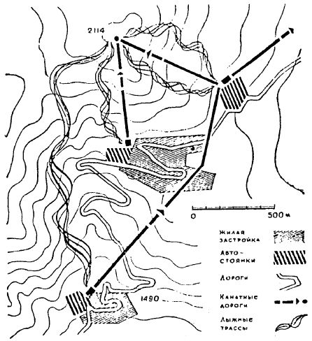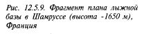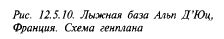 Горнолыжный спорт — это слалом, слалом-гигант и скоростной спуск. Основное сооружение — горнолыжная трасса. Трассы могут существовать самостоятельно, но, как правило, входят в состав горнолыжной базы специализированного спортивного комплекса. В комплекс должны входить горнолыжные трассы (одна и более); канатные (грузо-пассажирские) подъемники; вспомогательные и обслуживающие сооружения. Участки для зданий горнолыжных баз (без учета трасс) должны иметь площадь 1,6 - 1,8 га. Площадь автостоянок в районах среднегорья и холмистой местности рассчитывается по 25 м2 на одно место при одном месте на 10 катающихся. Для трасс предпочтительна северная ориентация склонов. Жилая застройка — у нижнего конца трассы. Для размещения гостиниц, спортивных залов, восстановительного комплекса учитывают источники водоснабжения, энергоснабжения, а также системы канализации. Целесообразно размещать горнолыжные базы вблизи рек, озер, шоссе и лесных массивов для использования их летом как альпинистских и туристических баз, климатологических домов отдыха. В зависимости от рельефа горных склонов возможны варианты расположения лыжных трасс. Веерообразное расположение — на склонах обширного амфитеатра. Лыжные поля со стартом на разных высотах и в разных местах, но с одним или несколькими финишными участками. Компактный веер имеет старты в различных местах одного склона, но с одним финишным участком; склон - с одной ориентацией по сторонам горизонта. Растянутый веер имеет старты в различных местах одного склона, но финишных участков может быть два или несколько; лыжные поля имеют большой разброс; ориентация склона может быть неодинаковой (рис. 12.5.9). Расположение трасс на двух противоположных склонах долины позволяет спортсменам выбирать склоны для разных погодных условий. Расположение одиночных лыжных трасс на одном склоне. Склон долины расчленен, имеются отроги. У каждой трассы свой финиш. Возможно расположение трасс на склонах различной ориентации. Рельеф склонов должен быть однородным. Трассы только на склоне северной ориентации (рис. 12.5.10). Качество горнолыжных трасс определяют: а) рельеф и ориентация склона, качество и устойчивость снежного по б) стабильный снежный покров 30 - 50см, продолжительность его со в) солнечное свечение — по количеству облачных часов в период с 9 до 404 физкультурно-спортивные сооружения
