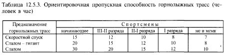 Горнолыжные трассы (особенно скоростной спуск, отвечающий международным требованиям) - сложное искусственное сооружение, состоящее из спланированного профиля с защитными устройствами от его деформации, желательно со снежными пушками, с подъемниками, стартовыми павильонами, финишными домиками и домиками для спасателей. Пропускная способность — число лыжников, которые в течение часа могут проходить по трассе, не создавая ситуаций опасности (табл. 12.5.3). Это зависит от тренированности среднего лыжника, количества сложных мест, протяженности трассы, среднего уклона, особенностей прохождения сложных участков, качества снежного покрова и т.д. Необходимо провести профилирование трассы, очистить ее от камней, пней, кустов, засеять склон устойчивыми травами. Все опасные места следует оградить сетчатыми или другими заграждениями для безопасности при спуске. 406 физкультурно-спортивные сооружения