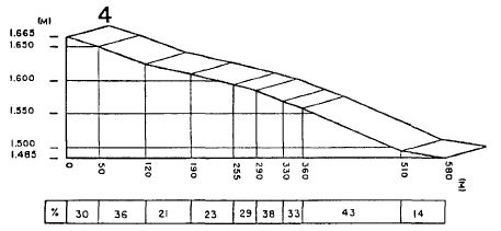 Выбор оптимального склона определяется по набору участков разного наклона. Трудные участки (не более 2 — 3) на трассе следует рассредоточить. Трасса скоростного спуска для мужчин — 3 км, перепад, высот - 800 м. Оптимальный набор участков склона для скоростного спуска: на 2 участка с перепадом высот по 50 м - уклон 10°; на 5 участков - 11-15° и 16-20°; на 4 участка — 20°. Один или два участка могут быть с контруклоном менее 10°. По ходу движения по трассе сверху вниз один из участков может быть круче 30°, но не более 45°. Не допускается склон, где подряд расположены два участка протяженностью по 600 м с перепадом высот по 50 м. Не следует иметь рядом участки с уклонами 25°. Возможно расположение на трассе один за другим участков одинаковой крутизны 11-15 и 16-20°, но не более трех подряд. На трассе могут быть участки, уклон которых превышает 30°, а также и более крутые, но имеющие контруклон. При выборе места строительства горнолыжной трассы необходимо учитывать ее назначение: для скоростного спуска, слалома-гиганта, супергиганта, слалома, массового катания. Date: 2015-06-07; view: 619; Нарушение авторских прав |