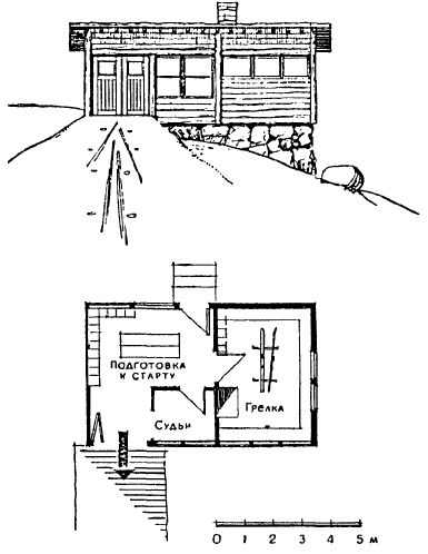 В группу хозяйственных помещений входят мастерские, в том числе по ремонту лыж и лыжного снаряжения, склад резервных лыж, склад инвентаря для уборки и оборудования территории. На базах, предназначенных для соревнований республиканского и более высокого масштаба по лыжному и горнолыжному спорту, следует дополнительно предусматривать гараж с ремонтной мастерской для трассопрокладывающих механизмов. На базах для прыжков с трамплина складские, а с учетом местных условий и другие вспомогательные помещения допускается располагать под эстакадой трамплина. В группу технических входят помещения для водоснабжения, теплоснабжения и вентиляции, энергоснабжения, а также блок помещений средств связи и информации, регистрирующих устройств, фотокинолабораторий. На лыжных базах, учитывая их расположение, характер эксплуатации, могут понадобиться блоки питания с различными формами обслуживания (от простейших буфетов до кафе-ресторанов), а также культурно-досуговые помещения. Здания лыжных баз кроме вспомогательных помещений могут включать и помещения для проживания лыжников — от хижин до крупных гостиниц. Возможно совмещение в одном здании вспомогательных и жилых помещений. Сооружения для лыжного спорта с проведением соревнований требуют высокой степени технического оснащения для подготовки спортсменов и их безопасности. СПЕЦИАЛИЗИРОВАННЫЕ ФИЗКУЛЬТУРНО-СПОРТИВНЫЕ СООРУЖЕНИЯ___________________________________________ 409 Специальные здания — хижины спасателей, судейские домики на стартах и финишах трасс, судейские вышки на трассах и трамплинах и др. Хижины спасателей обычно строят на туристических и спортивных трассах, а также в труднодоступных районах верхних ярусов гор. В них дежурят спасательные патрули и укрываются лыжники, застигнутые непогодой или темнотой. Стартовые домики сооружают у начала трасс скоростных спусков и слалома-гиганта. Домик может состоять из двух частей — стартовой и подготовительной. В стартовой части устанавливаются стойка для лыж, скамьи для ожидания и надевания лыж. Рядом размещается комната судей. В подготовительной части — комната для отдыха и обогрева спортсменов, санитарные узлы. Стартовая зона должна хорошо просматриваться судьями и спортсменами (рис. 12.5.12).