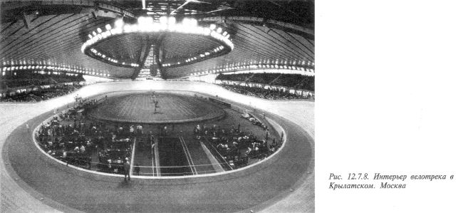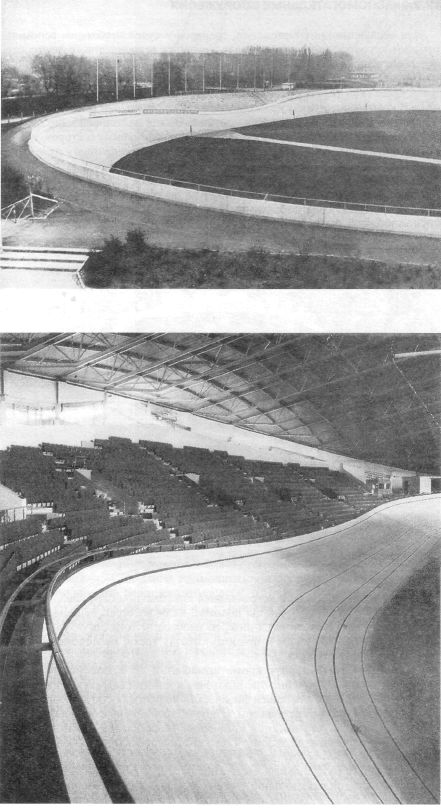 Для гита дополнительно устраиваются специально оборудованные места для судей — у внешней границы полотна. Если велотрек используется как финишная трасса шоссейных гонок, то необходим тоннель от улицы, подходящий под острым углом к прямому отрезку трека, расположенному напротив финишной прямой. Вспомогательный корпус кроме помещений обслуживания включает, как правило, залы для учебно-тренировочных занятий велосипедистов. Один из залов используется для общей физической подготовки спортсменов. В другом располагаются велотренажеры и другие тренажерные устройства. При велотреке устраиваются командные раздевальные на 15 спортсменов каждая, площадью 40 — 50м2. Число раздевальных определяется пропускной способностью велотрека, но не менее четырех. Особенность раздевальных - смежное расположение боксов для велосипедов. При каждой раздевальной — свой велосипедный бокс площадью 20 м2, планировка блоков раздевальных должна обеспечить выезд спортсменов на 422 физкультурно-спортивные сооружения трек. Ширина коридоров и пандусов, по которым спортсмены идут с велосипедами, должна быть не менее 2,5 м. В комплекс велотреков следует включать блок гаража для автомобилей и мотоциклов, в котором устраивается склад горюче-смазочных материалов, автомотозапчастей, ремонтная мастерская, бытовые помещения для шоферов, комната начальника гаража. Площадь гаража зависит от количества автомашин и мотоциклов, обслуживающих велотрек или трассу для шоссейных гонок. Гараж рекомендуется размещать на периферии комплекса велотрека. Примеры архитектурно-планировочных решений открытого (рис. 12.7.9) и крытого (рис. 12.7.10) велотреков дают представление об основных особенностях этих спортивных сооружений.