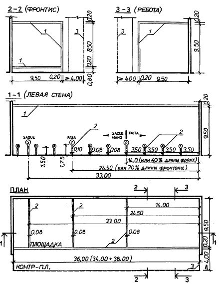 Существует более десяти разновидностей спортивной игры, именуемой «баскский мяч» (пелота баска), которая зародилась в испанской провинции Баскония много веков назад. Эти разновидности различаются по видам игрового инвентаря и размерам сооружений. Насчитываются не менее пяти типоразмеров преимущественно открытых сооружений и один тип крытого сооружения. Большинство видов баскского мяча практикуется на сооружениях, именуемых фронтонами. Фронтон - относительно узкая и длинная площадка, ограниченная стенами с торцов и по одной из продольных сторон. Торцевая стена, лицом к которой располагаются игроки, называется фронтис. Продольная стена слева от игроков именуется левой стеной. Торцевая стена за спиной игроков называется ребота. Справа от игроков стены нет, а границей площадки служит разметочная линия, за пределами которой в уровне площадки размещается свободная зона — контрплощадка — шириной не менее 4 м. Фронтис и ребота могут выступать за границу площадки до 1,1м. Чтобы мяч не вылетел за пределы фронтона, по наружному периметру контрплощадки устанавливается сетчатое ограждение на всю высоту фронтона. Часто сетчатое ограждение устраивают также, частично или полностью, поверх всего фронтона. Для защиты фронтона от неблагоприятной погоды поверх всего сооружения может быть устроено гидротеплоизолиро-ванное покрытие. Зрительские места размещаются вдоль сетчатого ограждения контрплощадки. Для некоторых видов баскского мяча строятся залы, называемые трин-кетами. Тринкет можно определить как фронтон с четырьмя стенами и без контрплощадки. Четвертая (правая) стена служит одной из продольных границ площадки и, поскольку зрители располагаются за ней, должна быть прозрачной (обычно применяется противоударное стекло). Получивший право на подачу игрок ударом какого-либо "орудия" или кулаком, в разновидности "сеста пунта" - броском, посылает мяч во фронтис. Отраженный от фронтиса мяч должен попасть в специально обозначенную зону площадки (между фронтисом и линией ошибки). После отскока он должен быть принят (отбит во фронтис) игроком противной стороны. Обмен такими ударами по мячу длится до ошибки одной из сторон, после чего партия возобновляется до следующей ошибки. Первая подача дается по жребию; все последующие получает сторона, не допустившая ошибки в непрерывном отрезке игры. Играют два противника или две пары. Разновидности баскского мяча чаще всего называют по орудию игры, а когда им служит теннисная ракетка, наименование обязательно содержит слово "фронтеннис". В длинном фронтоне (рис. 12.8.1) играют три разновидности: сеста пунта, пала ларга и ремонте. По первым двум проводятся соревнования крупнейшего масштаба.
