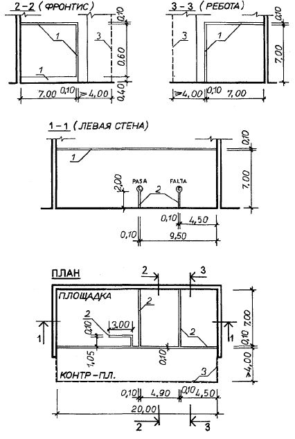 ет наименование "орудия" игры, представляющего собой ракетку с ободом из ивового прута и с короткой рукояткой. По шаре проводятся соревнования крупнейшего масштаба. Кубинский фронтон (двадцатиметровый) используется только для кубинского фронтенниса (рис. 12.8.6). К фронтонам и тринкетам предъявляются определенные строительные и функциональные требования. Стены должны быть ровными, гладкими, выполняться из твердого и прочного материала, обеспечивающего хороший отскок мяча. Для непрозрачных стен чаще всего используется монолитный бетон; Международная федерация баскского мяча рекомендует облицовывать фронтис пиленым камнем. Площадка (пол сооружения) обычно выполняется из литого асфальта или бетона. Отличительной особенностью тринкета, кроме прозрачной правой стены и отсутствия контрплощадки, является также устройство внутри игровой зоны крытой галереи для участников соревнований или тренировок (см. рис. 12.8.5). На непрозрачных стенах размечаются зоны, за пределы которых мяч не должен выходить. Границы этих зон лучше всего обозначать 426 ФИЗКУЛЬТУРНО-СПОРТИВНЫЕ СООРУЖЕНИЯ