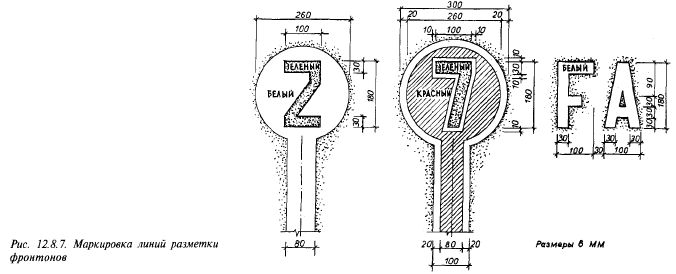 полосами из листового металла, однако допускается применение прочной окраски. На площадках и левых стенах краской наносятся разметочные линии, обозначающие зоны подачи и приема мяча, а также линии, облегчающие ориентировку спортсменов в игровом пространстве. Вертикальные линии на левых стенах маркируются цифрами, надписями и буквами. При этом основные линии, продолжающиеся на площадке, выделяются размерами и цветом. Надписи имеют следующее значение: саке — линия подачи; паса — линия приема; фальта — линия ошибки; саке мано — подача рукой; ларга — длинная зона; корта — короткая зона. В тринкетах вместо вертикальных линий левой стены на навесе галереи короткими линиями и надписями обозначают зоны, соответствующие разметке на площадке. Внутренние поверхности стен и площадки должны иметь темную окраску, обеспечивающую наилучшую видимость мяча. Линии разметки наносятся контрастной по отношению к фону краской. Обычно линии на площадке и левой стене — белые (основные — с красной серединой), металлические разметочные полосы - красные (рис. 12.8.7). Рекомендуемый уровень искусственной освещенности — не менее 600 люксов. В заключение следует отметить, что в данной главе авторы отразили, в 428 ФИЗКУЛЬТУРНО-СПОРТИВНЫЕ СООРУЖЕНИЯ