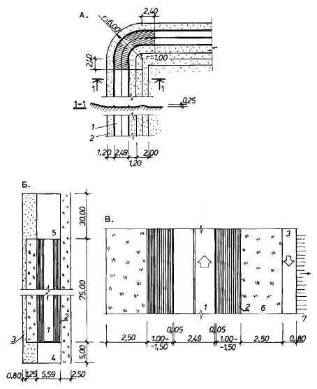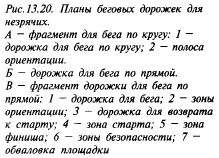 ФИЗКУЛЬТУРНО-СПОРТИВНЫЕ СООРУЖЕНИЯ, ИСПОЛЬЗУЕМЫЕ ДЛЯ ЗАНЯТИЙ ИНВАЛИДОВ_________________________ 453 Для ориентации по периметру устраивается полоса в форме двускатной крыши шириной 2 м и высотой в коньке 12-25 см. Далее без перепадов -переход от полосы ориентации к покрытию беговой дорожки. Полоса ориентации должна отличаться по материалу от покрытия дорожки для бега или покрытия площадки (газона) для игр: газон - грунт, газон - искусственный материал. Минимальная длина дорожки для занятий бегом по кругу - 250 м, ширина (на 2 дорожки - с учетом разделительных полос) - 2,49 м. Для ориентации инвалидов следует предусмотреть: - различный материал дорожки и полосы ориентации; - полосы ориентации шириной 1,2 - 1,5 м; - зоны безопасности по внешнему контуру зон ориентации шириной 1 м; - обозначение поворота сменой покрытия на расстоянии 2,4 м до начала - виражи на повороте (максимальный уклон 6 %). Дорожка для бега по прямой (длина 100 м, зона старта 5 м, зона финиша 25 м) изолируется от дорожки для бега по кругу. Покрытие зон и финиша должно отличаться от покрытия дорожки. Стартовая линия должна быть осязаема. Ширина двух дорожек - 2,24 м и 0,15 м — на границы и среднюю линию (разных цветов), ширина полос ориентации - 1,2 - 1,5 м, зон безопасности -1 м. Обратный путь к старту должен быть отделен от дорожки для бега. Минимальное расстояние между ними - 2,5 м, ширина пути 0,8 - 1,2 м. Основной ориентир - звуковой маяк (рис. 13.20). Размеры места для прыжков в длину для инвалидов по зрению 5-8 м х 9-10 м. Дорожка для разбега длиной 25 м, шириной 1,5 - 3 м, полосы ориентации 1,2 - 2 м с каждой стороны.