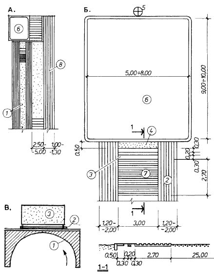 454 физкультурно-спортивные сооружения Для ориентации за 4 м от края ямы устраивается фактурная полоса: 2,7 м - зона оповещения, 0,8 м - толчковая зона, 0,5 м - мягкое покрытие. Акустический ориентир - звуковой маяк за ямой. Обратный путь устраивается отдельно от дорожки для разбега (ширина пути 1 - 1,3 м), на расстоянии 2,5 м (рис. 13.21). При прыжках в длину для инвалидов с ПОДА вместо доски для отталкивания организуется зона длиной 80 см с расстоянием от передней кромки не более 1 см. Для выполнения прыжков в высоту рекомендуется фактурной поверхностью выделить зону разбега. Рейка или матерчатые щиты, цветные, контрастные, для ориентации можно повесить на рейку платок. Толщина подушки приземления 0,5 - 0,6 м. На игровых площадках для инвалидов требуются полосы ориентации и безопасности (рис.13.22).По опыту Германии, зафиксированному в нормах, рекомендуются такие размеры полей и площадок: 68 х 105 м, 27 х 45 м, 27 х 15 м, 7 х 14 м, 5 х 25 м. Специальные планировочные приспособления необходимы для доступа инвалидов с ПОДА к лужайке для игр в кегли. Канавку вокруг лужайки можно перекрыть небольшим съемным пандусом (рис 13.23). Открытые бассейны. Все рекомендации по крытым бассейнам применимы и к открытым. Если из открытых бассейнов выходят через односторонние турникеты, то должен существовать обходной путь для инвалидов. Все внешние площадки должны иметь помещение из нескользкого материала с минимальным количеством стыков. На путях сообщения между открытым бассейном и общественными зонами (солярием, террасой кафе) не должно быть перепада уровней.