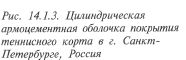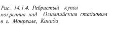 Сводчатые конструкции — цилиндрические оболочки или своды — по статической схеме близки к складкам (рис. 14.1.3). Они также могут быть сборными (и тогда образуются из криволинейных элементов), монолитными или сборно-монолитными. На торцах сводов обычно устраивают диафрагмы в виде арок или ферм. Продольные края оболочки имеют бортовые балки, а опирать их можно на четыре опоры по углам, на стены либо на ряд колонн вдоль длинных сторон оболочки. Железобетонные купола используют при перекрытии спортивных сооружений с большими пролетами. Крытый стадион в Сиэтле — круглое здание диаметром 220 м. Он пере- КОНСТРУКЦИИ ПОКРЫТИЙ СПОРТИВНЫХ СООРУЖЕНИЙ_________________________________________________________ 471