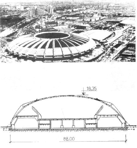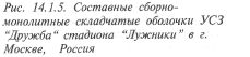 крыт волнистым железобетонным куполом диаметром 201,6 м со стрелой подъема 33,5 м. Каждая из 40 волн купола имеет гиперболическую поверхность толщиной 127 мм, гребни волн выполнены в виде ребер высотой 1,83 м. Конструкция покрытия над Олимпийским стадионом в Монреале (Канада) представляет собой ребристый купол с 34 арочными ребрами, соединенными железобетонной решеткой. Над игровым полем оставлен проем, перекрытый тентовой конструкцией (рис. 14.1.4). Составные оболочки представляют собой комбинации различных типов оболочек. УСЗ «Дружба» в Москве состоит из двух оболочек. Нижняя складчатая оболочка, образующая стены сооружения, несет на себе пологую центральную оболочку на квадратном плане 48 х 48 м с радиусом кривизны 80 м и стрелой подъема 1/7,5 (рис. 14.1.5).
