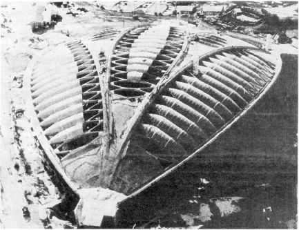 472 ФИЗКУЛЬТУРНО-СПОРТИВНЫЕ СООРУЖЕНИЯ Своеобразная и запоминающаяся архитектурная форма велодрома в Монреале достигнута благодаря применению оригинальной конструктивной системы покрытия (рис. 14.1.6). На гигантские предварительно напряженные железобетонные арки опираются Y- образные балки с покрытием пластиковыми панелями.