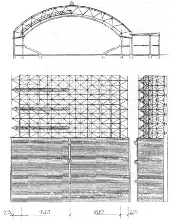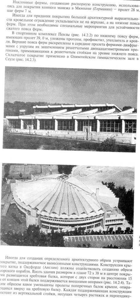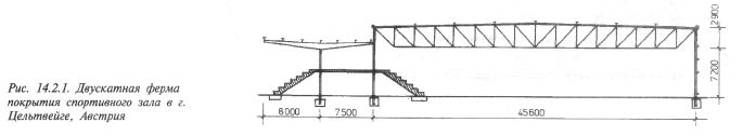Для покрытия зальных помещений общественных зданий применяют различные конструктивные металлические системы. Наиболее простые из них - балки и фермы со сборными железобетонными плитами покрытий либо с профилированным настилом с укладываемым по ним утеплителем и кровлей. Обычно балками перекрывают пролеты от 9 до 24 м, фермами — от 18 до 60 м. В Цельтвейге (Австрия) возведено спортивное здание с залом размерами в плане 64 х 45,6 м и двухэтажная пристройка, с одной стороны которой находятся трибуны зала, а с другой - трибуны стадиона (рис. 14.2.1). Несущими конструкциями покрытия зала служат стальные двускатные фермы с раскосной решеткой пролетом 45,6 м, высотой от 2,9 до 3,4 м. По фермам уложены двутавровые прогоны, затем профилированный настил и кровельный ковер из битумокартона. Несущие конструкции покрытия пристройки и трибун стадиона — стальные балки двутаврового сечения длиной 15,5 м с консолями длиной 8 м.
