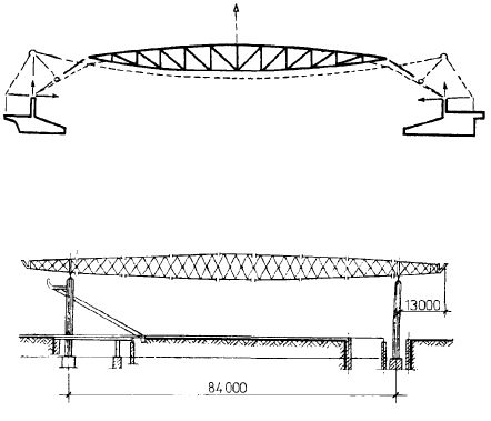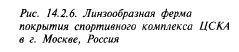 лярно расположенных к главной балке растяжек, поддерживающих стойку на плоскости. Нагрузка от поддерживающих конструкций передается на сваи. На периферийные стойки, расположенные вдоль здания, передается 20 процентов нагрузки от покрытия. В покрытиях больших пролетов применяют линзообразные фермы, которые разнообразят архитектуру залов. Ледовый стадион в Херенвейне (Голландия) размерами в плане 90 х 200 м перекрыт линзообразными фермами высотой 5,5 м и пролетом 55 м (рис. 14.2.5). Такое уменьшение пролета удалось получить, опирая фермы на 12-метровые консоли, выступающие над рядами трибун. Шаг ферм — 7,2 м. Сверху они покрыты светопрозрачной кровлей. Еще большего пролета линзообразные фермы применены в покрытии спортивного комплекса ЦСКА в Москве. Общий размер комплекса 306 х 110 м, высота 18,4 м (рис. 14.2.6). Пространственные несущие фермы покрытия комплекса пролетом 84 м с двумя консолями по 13 м смонтированы блоками размером в плане 104 х 2,5 м, высотой в центре 6 м и по краям 2 м. Блоки набраны из плоских предварительно напряженных панелей, состоящих из тонколистовой обшивки толщиной 1,5 мм, натянутой на каркас из уголков. Предварительное натяжение обшивки панелей позволило значительно увеличить жесткость покрытия, отказаться от горизонтальных связей в уровне покрытия, улучшить статическую работу конструкции и отказаться от дополнительных мероприятий для восприятия местных снеговых нагрузок.