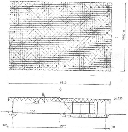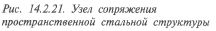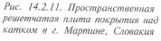 Структурные стержневые плиты широко используются как покрытия спортивных сооружений. В отличие от плоских ферм они при тех же перекрываемых пролетах имеют в 2-3 раза меньшую высоту, могут применяться с укрупненной сеткой колонн, собираются на земле из однотипных элементов и монтируются целиком или крупными блоками. Для соединения стержней, составляющих структурную конструкцию, применяют различные узловые элементы систем «Меро», «Октаплат», «Триодетик» с и др. В городе Мартин (Словакия) над существующим катком возведено покрытие в виде стальной пространственной решетчатой плиты размерами в плане 86,4 х 57,6 м (рис. 14.2.11). Верхний и нижний пояса сдвинуты один относительно другого на половину стороны квадрата ячеек. Высота плиты -