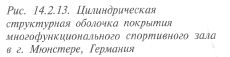 Покрытие конноспортивного и многофункционального зала в Мюнстере (Германия) — цилиндрическая структурная оболочка пролетом 40 м, длиной 80 м. Трубчатые элементы оболочки соединены узлами «Меро». Высота оболочки - 2,7 м, сетки поясов - 4,1 х 3,655 и 4,5 х 3,655 м (рис. 14.2.13). Сетчатый купол пролетом 70 м со стрелой подъема 25,6 м использован