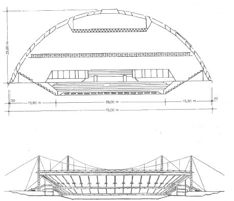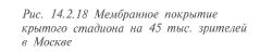 ланы вырезы, исключающие возможность появления складок мембраны в приконтурной зоне. Монтаж листов мембраны производился на радиальных и кольцевых профилях, вывешиваемых между наружным и внутренним кольцами. Для стабилизации мембраны выполнялось ее предварительное натяжение путем стяжки мембраны и нижних поясов вантовых ферм, радиально расположенных под мембраной. Мембранное покрытие на эллиптическом плане применено для крытого стадиона на 45 тыс. зрителей в Москве (рис. 14.2.18). По наружному контуру эллипса с размерами осей 224 х 184 м с шагом 20 м расположены стальные решетчатые колонны высотой 33 м. По оголовкам колонн уложено
