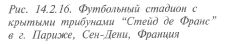 КОНСТРУКЦИИ ПОКРЫТИЙ СПОРТИВНЫХ СООРУЖЕНИЙ_________________________________________________________ 479 для ограждения стадиона в Абу-Даби (рис. 14.2.14). Элементы купола также соединены узлами «Меро». Структурные плиты могут применяться в сочетании с вантами. Покрытие стадиона на 120 тыс. зрителей в Мадриде (рис. 14.2.15) имеет прямоугольную форму со скошенными углами размерами 240 х 216 м. В центре над футбольным полем устроен проем 115 х 60 м. Конструкция покрытия — стальная решетчатая плита, подвешенная на вантах к оголовкам восьми железобетонных пилонов высотой 55 м. Схожее решение применено в покрытии над трибунами стадиона в Сен-Дени (Франция, рис. 14.2.16). Мембранные конструкции, состоящие из сжатого опорного контура и тонколистовой висячей мембраны, могут использоваться как в покрытиях больших стадионов, так и в покрытиях спортивных залов пролетами от 30 до