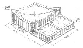 речное сечение 3 х 2 м. Внутренние арки объединены связевой фермой. Нагрузка от арок передается на массивные железобетонные устои, соединенные затяжкой. При монтаже между парами наружных и внутренних арок вывешены «постели» шириной 700 мм из стального листа толщиной 6 мм. По мембране уложен утеплитель из двух слоев минераловатных плит, стяжка из цементного раствора толщиной 20 мм и гидроизоляционный ковер из рубероида на мастике с фольгорубероидом поверх него. Цилиндрические мембранные оболочки на прямоугольном плане более просты в изготовлении и монтаже, чем мембраны на круглом и эллиптическом планах. Такие покрытия монтируются из небольшого количества однотипных элементов, причем каждый элемент может быть изготовлен на заводе в виде рулона, перекрывающего пролет покрытия. Стабилизация цилиндрических мембранных покрытий может производиться различными способами. Так, при строительстве плавательного бассейна на стадионе «Пионер» в Харькове (Украина) стабилизация покрытия произведена жесткими вантами, расположенными по направляющим цилиндрической поверхности. Для уменьшения изгибающих моментов в торцевых элементах опорного контура цилиндрической мембранной оболочки покрытия Дворца спорта в Бишкеке (Киргизия) они усилены шпренгельными параболическими затяжками, которые передают усилия распора мембран в углы контура. Передача усилий в углы контура (и исключение тем самым его изгиба) может быть произведена и непосредственным усилением мембраны диагональными подкреплениями. Покрытие универсального спортивного комплекса в Москве состоит из мембраны размерами в плане 66 х 60 м и двух мембран 36 х 36 м (рис. 14.2.20).