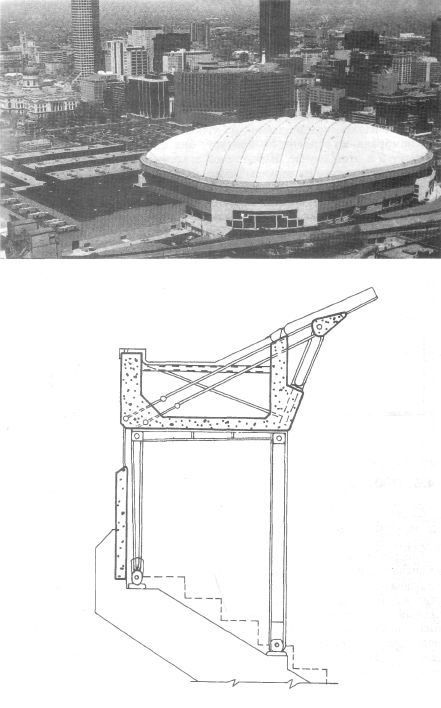 Воздухоопорные конструкции покрытий позволяют перекрывать большие пролеты при малом собственном весе. Оболочка такого покрытия удерживается в проектном положении с помощью избыточного давления возду- КОНСТРУКЦИИ ПОКРЫТИЙ СПОРТИВНЫХ СООРУЖЕНИЙ 495 ха. Применяются два типа воздухоопорных оболочек — однослойные и двухслойные. В первом случае избыточное давление воздуха создается внутри всего перекрываемого помещения, а во втором — поддерживается только внутри линзовидного двухслойного покрытия. Линзовидные пневматические оболочки хорошо воспринимают снеговые и ветровые нагрузки, а также имеют высокие звукоизоляционные и теплоизоляционные качества. Этот тип покрытия избавляет занимающихся от воздействия избыточного давления. Пневматические оболочки покрытий выполняются обычно с применением ткани из стекловолокна с двухсторонней тефлоновой пропиткой. При небольших перекрываемых пролетах ткань, поддерживаемая избыточным давлением, полностью может сопротивляться внешним воздействиям. При больших пролетах необходимо использовать тросы для усиления покрытия. С целью увеличения перекрываемых пролетов вместо ткани можно применять стальные листы. Кроме того в этом случае упрощается крепление оболочки к опорному контуру. В Ванкувере (Канада) построено спортивно-зрелищное здание с воздухоопорной оболочкой покрытия (рис. 14.5.1). Форма покрытия близка к эллипсу, размеры в плане — 231 х 190 м.