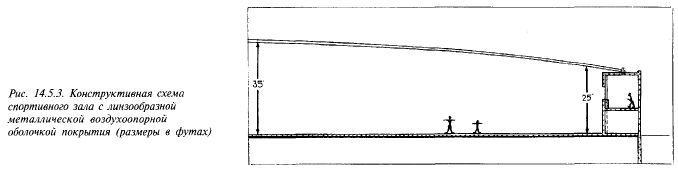 Мембрана площадью 5000 м2 из нержавеющей стали толщиной 1,5 мм поддерживается в выпуклом состоянии давлением 0,35 КПА. Высота мембраны в центре покрытия — 12 м, на опорах — 8 м. Если воздушное давление будет падать, крыша здания из купольной станет вогнутой, но, так как мембрана закреплена по контуру, она способна нести расчетную нагрузку и в этом случае. Избыточное давление, поддерживающее крышу, действует только на верхнем этаже, на остальных двух этажах здания специальные двери предотвращают действие избыточного давления. Ниже мембраны расположен подвесной утепленный акустический потолок. Благодаря обогреву крыши расположенными внутри нее калориферами снег с крыши стаивает. Линзовидная пневматическая оболочка с нижней и верхней металлическими мембранами показана на рис. 14.5.3.
