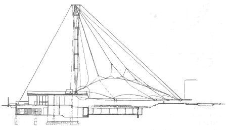 В некоторых случаях в теплое время года кроме покрытия могут раскрываться и стены. Наряду с жесткими конструкциями в трансформируемых сооружениях применяются и тентовые конструкции. На рис. 14.6.2 показан бассейн, накрытый тентом, который на вантовых растяжках подвешен к стальной мачте. С помощью систем блоков тент может быть раскрыт или сложен.