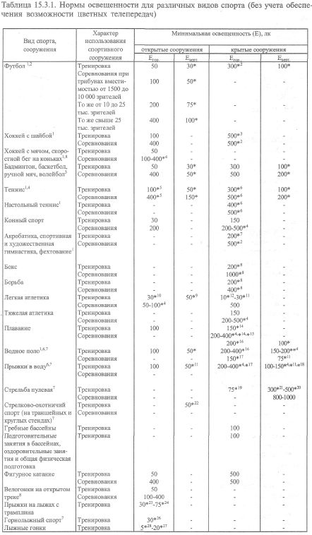 1) Коэффициент неравномерности освещенности (отношение минимальной освещенности к максимальной) для открытых сооружений должен быть не менее 1:3. 510 физкультурно-спортивные сооружения 2) По рекомендации Международной комиссии по освещению (МКО) 3) Для бадминтона согласно рекомендациям МКО: в крытых сооруже 4) Согласно рекомендациям МКО: коэффициент неравномерности ос 5) Согласно рекомендациям МКО для фехтования в помещении требу 6) Согласно рекомендациям МКО коэффициент неравномерности ос 7) Освещенность для соревнований в нормах РФ не определена, исходя 8) Нормы освещенности гонок в крытых велотреках, а также скорост * Вертикальная освещенность в плоскости, проходящей через продольную ось поля с обеих ее сторон. *2 Эти значения соответствуют рекомендациям МКО. *3 По рекомендациям МКО - 300 лк. *4 Освещенность выбирается в зависимости от вместимости трибун. *5 Согласно рекомендациям МКО уровни освещенности в закрытых сооружениях соответственно 500 лк для тренировок и 750 лк для турниров. *6 Согласно рекомендациям МКО уровни освещенности открытых кортов соответственно 300 лк для тренировок и 500 лк для турниров. *7 Согласно рекомендациям МКО — 300 лк. *8 Согласно рекомендациям МКО для бокса и борьбы требуются уровни освещенности 300 лк для тренировок и 1500-1900 лк - для соревнований. *9 Освещенность основной части сектора, дорожки. *10 Освещенность остальной части сектора, дорожки. *11 Освещенность в зоне прыжка. *12 Освещенность в зоне полета снаряда. *13 Согласно рекомендациям МКО для легкой атлетики в крытых сооружениях требуются уровни освещенности 300 лк для тренировок. *14 Согласно рекомендациям МКО для плавания в крытых плавательных бассейнах требуются уровни освещенности 300 лк для тренировок и 500 лк для соревнований. *15 Согласно требованиям Международной федерации по плаванию нормы искусственного освещения составляют для соревнований 400 лк. *16 Согласно рекомендациям МКО для водного поло в крытых бассейнах требуются уровни освещенности 300 лк для тренировок и 500 лк для соревнований. *17 Согласно рекомендациям МКО для прыжков в воду требуются уровни освещенности 300 лк для тренировок и 500 лк для соревнований. *18 Согласно рекомендациям МКО вертикальная освещенность в зоне прыжка должна составлять 200 лк. *19 Освещенность в пределах огневой позиции. *20 Средняя освещенность в плоскости мишеней (с черным кругом и силуэтами) с коэффициентом неравномерности (отношение минимальной освещенности к максимальной) не менее 1:2. *21 То же, что и в плоскости движения мишени "бегущий кабан" в пределах окна. *22 Освещенность в зоне полета мишеней. *23 Освещенность на поверхности стартовой площадки, горы разгона и горы приземления. *24 Освещенность на поверхности стола отрыва. *25 Освещенность в зоне траектории прыжка. *26 Средняя освещенность с коэффициентом неравномерности (отношение минимальной освещенности к максимальной) не менее 1:5. *27 Средняя освещенность в зоне старта и финиша, а также спусков с уклоном более 15°. Коэффициент неравномерности (отношение минимальной освещенности к максимальной) не менее 1:10. *28 Средняя освещенность на остальных участках трассы с коэффициентом неравномерности не менее 1:25. ИНЖЕНЕРНОЕ ОБОРУДОВАНИЕ, ОСВЕЩЕНИЕ И ЦВЕТ В СПОРТИВНЫХ СООРУЖЕНИЯХ______________________________ 511 Требования к искусственному освещению при трансляции по цветному телевидению значи