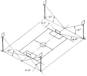 Очень важно ограничить слепящее действие световых приборов. Если обеспечены нормируемые уровни освещенности, но не ограничено слепящее действие осветительной установки, то и спортсмены, и зрители, и судьи будут испытывать дискомфорт, что может повлечь за собой судейские ошибки и травмы спортсменов. Снизить яркость световых приборов в направлении глаза могут рассеиватели и другие устройства, однако главное — рациональное размещение и ориентация световых приборов. В большинстве видов спортивных игр, в беге и др., когда зрение спортсмена перемещается по продольной оси сооружения, наиболее целесообразно верхне-боковое освещение. При нем в спортивных залах не допускается размещать световые приборы на торцевых стенах или вблизи них на потолке. При верхне-боковом освещении открытых площадок (полей) для спортивных игр (кроме городков) угол между поверхностью поля для игры и перпендикуляром из оптического центра светового прибора на продольную ось поля для игры должен быть не менее 27° (рис. 15.3.1), а приборы следует устанавливать на высоте более 10м.