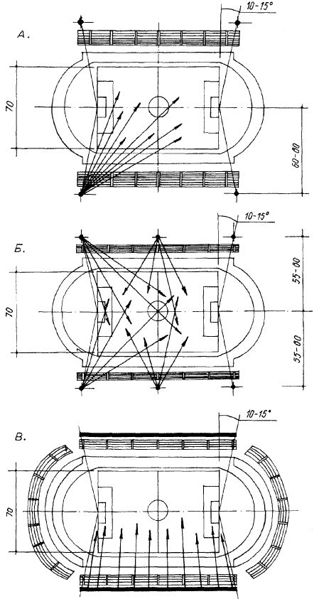 ИНЖЕНЕРНОЕ ОБОРУДОВАНИЕ, ОСВЕЩЕНИЕ И ЦВЕТ В СПОРТИВНЫХ СООРУЖЕНИЯХ______________________________ 513 раской поверхностей для исключения бликов. Однако перенаправление части светового потока на потолок снизит освещенность площадки или потребуется увеличить мощности световых приборов. При искусственном освещении открытых полей для футбола, входящих в состав спортивных арен, можно использовать три системы установки осветительных приборов: мачтовые, линейные и смешанные (рис. 15.3.2). Линейная система, приведенная на рисунке, может применяться, если над трибуной есть козырек, высота которого достаточна, чтобы удовлетворить условиям, приведенным на рис. 15.3.1. При смешанной системе по одну сторону арены осветительные приборы устанавливаются на козырьке, а на противоположной стороне (обычно здесь нет трибуны) — на мачтах. При освещении отдельных футбольных полей с трибунами осветительные приборы могут размещаться так же, как и на полях, входящих в состав спортивной арены. Для освещения хоккейного поля с успехом применяются верхне-боковые системы с наклонно размещенными вдоль длинных сторон площадки световыми приборами (на опорах) с концентрированным светораспределением (рис. 15.3.3 А). Можно использовать и верхнюю систему освещения с подвесными световыми приборами, установленными на высоте не менее 6 м (рис. 15.3.3 Б). Велотреки освещают, как правило, приборами направленного действия, размещенными на опорах высотой 10 м c консолями, вынесенными на 3-5 м над полотном трека. Опоры устанавливаются вдоль наружной кромки трека; световые приборы должны иметь наклон в сторону движения, чтобы их