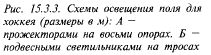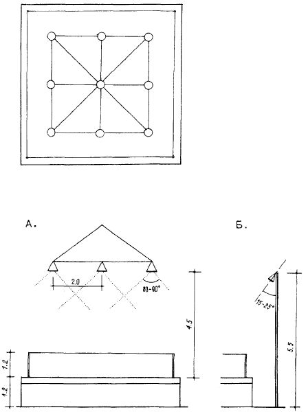 Открытые площадки для баскетбола (рис. 15.3.7), волейбола (рис. 15.3.8), бадминтона освещаются верхне-боковыми системами с мачтами или линиями подвески светильников. Повышенные требования к зрительному восприятию мяча малого размера и большой скорости его полета увеличивают требования к освещению теннисных кортов. Система искусственного освещения этих площадок (рис. 15.3.9) включает светильники направленного света на опорах высотой не менее 8 м для игры начинающих и спортсменов младших разрядов и не менее 12 м- для игроков высших разрядов (рис. 15.3.9 А). Эти же высоты требуются и при лампах накаливания, подвешиваемых на тросах (рис. 15.3.9 Б).