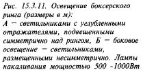 В крытых теннисных залах есть специфика, связанная с необходимостью обеспечения равномерной яркости освещения, при которой хорошо виден летящий мяч. Для этого избегают установки источников большой яркости на потолках, а при светлом потолке его яркость может быть ограничена вертикальными перегородками. Боковое освещение может успешно сочетаться с верхним, которое должно давать до 30% требуемого уровня освещенности. Система освещения отраженным светом, несмотря на высокую эффективность, применяется редко, так как очень неэкономична. При расположении светильников по бокам теннисной площадки необходимы меры по снижению яркости, экранируя их рассеивателями или жалюзийными решетками. Угол экранирования в вертикальной плоскости, параллельной продольной оси площадки, должен быть не меньше 30°, а по возможности - 45°. В комбинированной (верхне-боковой) системе освещения, как правило, используются потолочные светильники с защитным углом около 45°, 518 ФИЗКУЛЬТУРНО-СПОРЕТИВНЫЕ СООРУЖЕНИЯ равномерно размещенные над поверхностью площадки. При высоте зала более 10 м могут быть использованы газоразрядные лампы высокого давления. Трибуны по бокам площадки освещают источником света тою же типа, что и саму площадку, но с освещенностью трибун не более 300% освещенности площадки. Освещение боксерского ринга (аналогично могут освещаться и борцовские ковры) характеризуется низкой подвеской светильником (рис. 15.3.11); поэтому в универсальных залах они должны быть съемными.