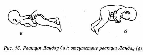 Реакция Ландау и ответственность взрослых В течение первого года жизни совершается важное событие. Это «открытие» мышц спины. И в первый же момент этого события включается рефлекс «зеленого света». Ощущения, которые при этом возникают, сохраняются на всю жизнь. При рождении ребенок — беспомощное существо, совершающее множество движений, направленных на то, чтобы держаться как можно ближе к матери. Он не может держать голову, не может сидеть. Функция мышц в течение первых недель жизни неодинакова: мышцы передней стороны туловища находятся в активном состоянии. Мышцы задней стороны не активны. Они как бы все еще находятся в состоянии сна. Но это продолжается не очень долго. Вскоре после третьего месяца возникают удивительные изменения. Ребенок постепенно приучается поднимать и держать голову. Ребенок, лежа на животе, поднимает голову так, что лицо располагается вертикально, а рот — горизонтально. Он приобретает ощущение равновесия головы и ощущение горизонта. Это очень важно именно для человека. Когда голова поднята и ориентирована по отношению к земной поверхности, то ребенок начинает постепенно овладевать элементами ходьбы и стояния. Процесс обучения этим функциям, генетически запрограммированный, идет очень активно. Ребенок становится способным сокращать мышцы шеи. Он, однако, все еще не может так же сокращать мышцы спины. Однако, постепенно, в течение нескольких месяцев, он начинает выгибать спину. Но это еще не все. Ребенок, кроме того, приобретает способность поднимать и выпрямлять руки и ноги. На этой стадии возникает новая реакция — реакция Ландау (рис. 16, а). Если ладонь взрослого располагается под грудью ребенка, лежащего на животе, и поднимается, то ребенок не только поднимает голову, но также выгибает спину и вытягивает ноги. Приходят в действие мышцы, обеспечивающие стояние и ходьбу. Это и есть реакция Ландау — очень важная стадия развития. Если она отсутствует в возрасте б месяцев (рис. 16, б), то это признак серьезного заболевания, например, церебрального паралича. Но если развитие идет нормально, то после шести месяцев ребенок может лежа на животе осуществлять плавательные движения, поднимая голову и двигая руками и ногами.