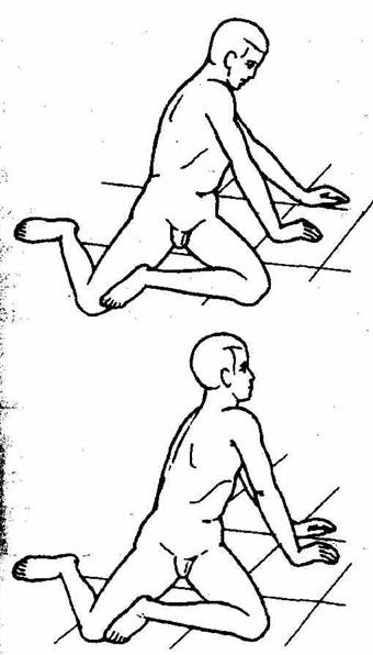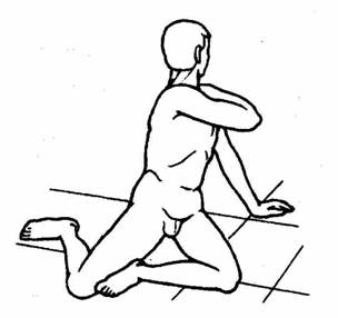 3. Положение Сядьте на пол, примите прежнее положение. Однако, в отличие от прежнего, обе руки упираются в пол, причем правая рука располагается перед левой.